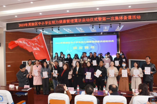 區教育局四級調研員何利民、武漢市視防中心主任楊莉華、武漢市中小學生視力健康管理專家委員會專家吳風波,為44名宣講團成員頒發了聘書,并由何利民宣布宣講團正式成立,宣講團副團長胡春華向宣講團授旗。
