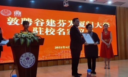 圖為時任廈門大學校長、現(xiàn)任廈門大學黨委書記張榮在廈門大學百年校慶之日為谷建芬頒發(fā)“駐校名家”證書