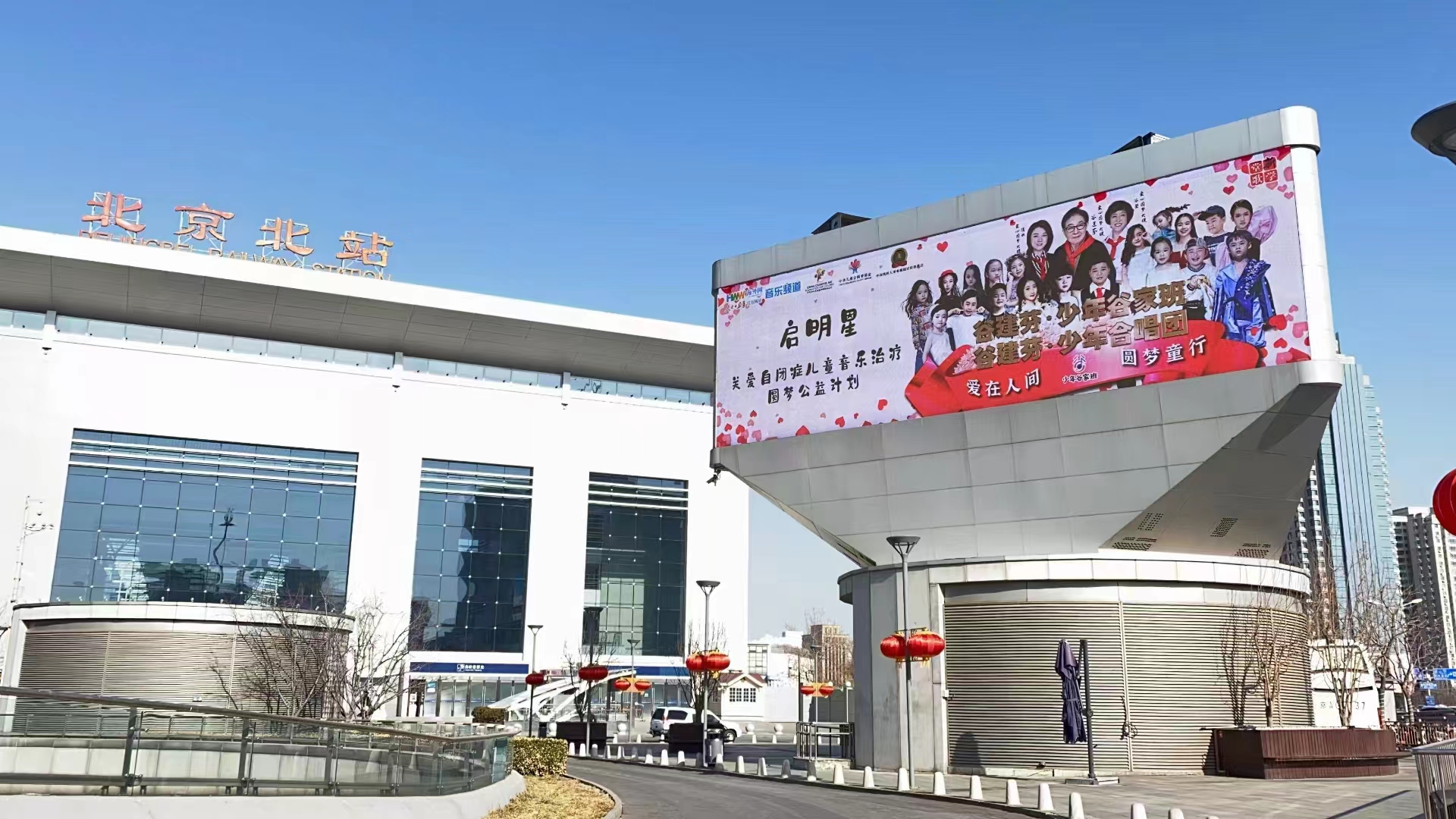 圖為位于北京北站室外電子大屏項目公益宣傳,“啟明星”關愛自閉癥兒童音樂治療公益項目發起人谷建芬、中國音樂學院青年教師隋欣傾情參與