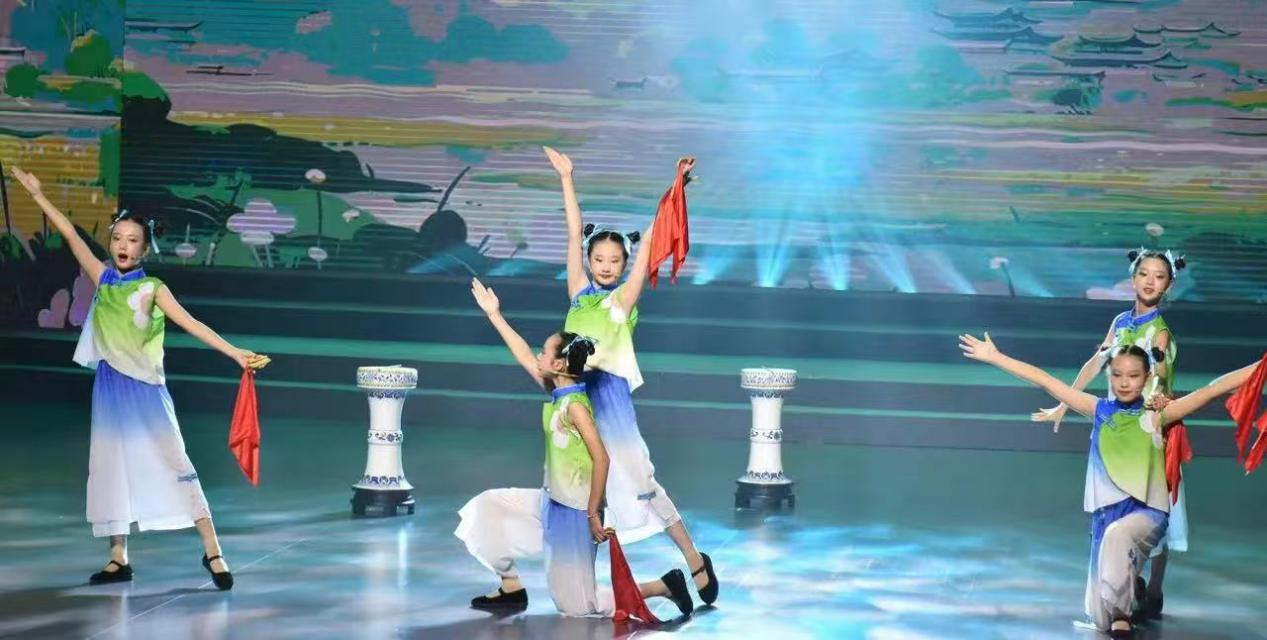 8月3日晚,江西景德鎮市浮梁縣第一小學的5名學生登上舞臺。她們說著流暢而又風趣的景德鎮方言,敲擊著色澤雅麗、清麗脫俗的景德鎮青花瓷大鼓,搭配著獨特的唱腔和優美的舞蹈,贏得了專家評委的好評和現場觀眾熱烈的掌聲。參與《能干娃》演出的5名小演員是從該校500多名學生中選拔出來的。2023年3月到7月,她們開始了長達4個多月的訓練,從學習景德鎮方言,到練習鼓點技法,再到學習唱腔和表演,節目質量逐步得到提升。