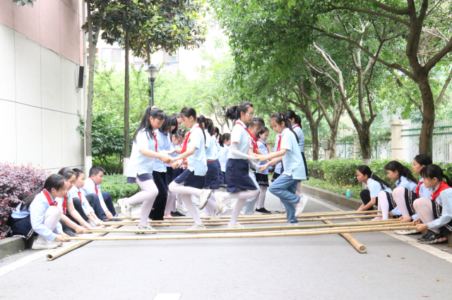 為優化課間活動,興龍湖小學除了開展豐富多彩的體育活動、游戲活動以外,還加大了對體育場地、設施器材的投入,增設了攀爬公園、蹦床公園和滑梯公園,并與現有的籃球公園、足球公園和民間游戲公園等活動場地相結合,形成了六大“體育公園”。學校還科學設置課間體育鍛煉任務群,引導6個年級分批循環使用,使校園形成了“處處是設施、時時可鍛煉、人人能參與”的“課間樂動圈”。