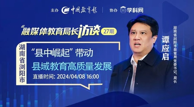 歷經(jīng)20多年,蹚出了縣中崛起的“瀏陽(yáng)路徑”,而優(yōu)質(zhì)教育也成為了瀏陽(yáng)的閃亮名片。本期,我們就邀請(qǐng)到了湖南瀏陽(yáng)市教育局局長(zhǎng)譚應(yīng)啟做客《中國(guó)教育報(bào)》融媒體教育局長(zhǎng)訪談直播間,與大家分享瀏陽(yáng)市教育高質(zhì)量發(fā)展的探索與實(shí)踐!