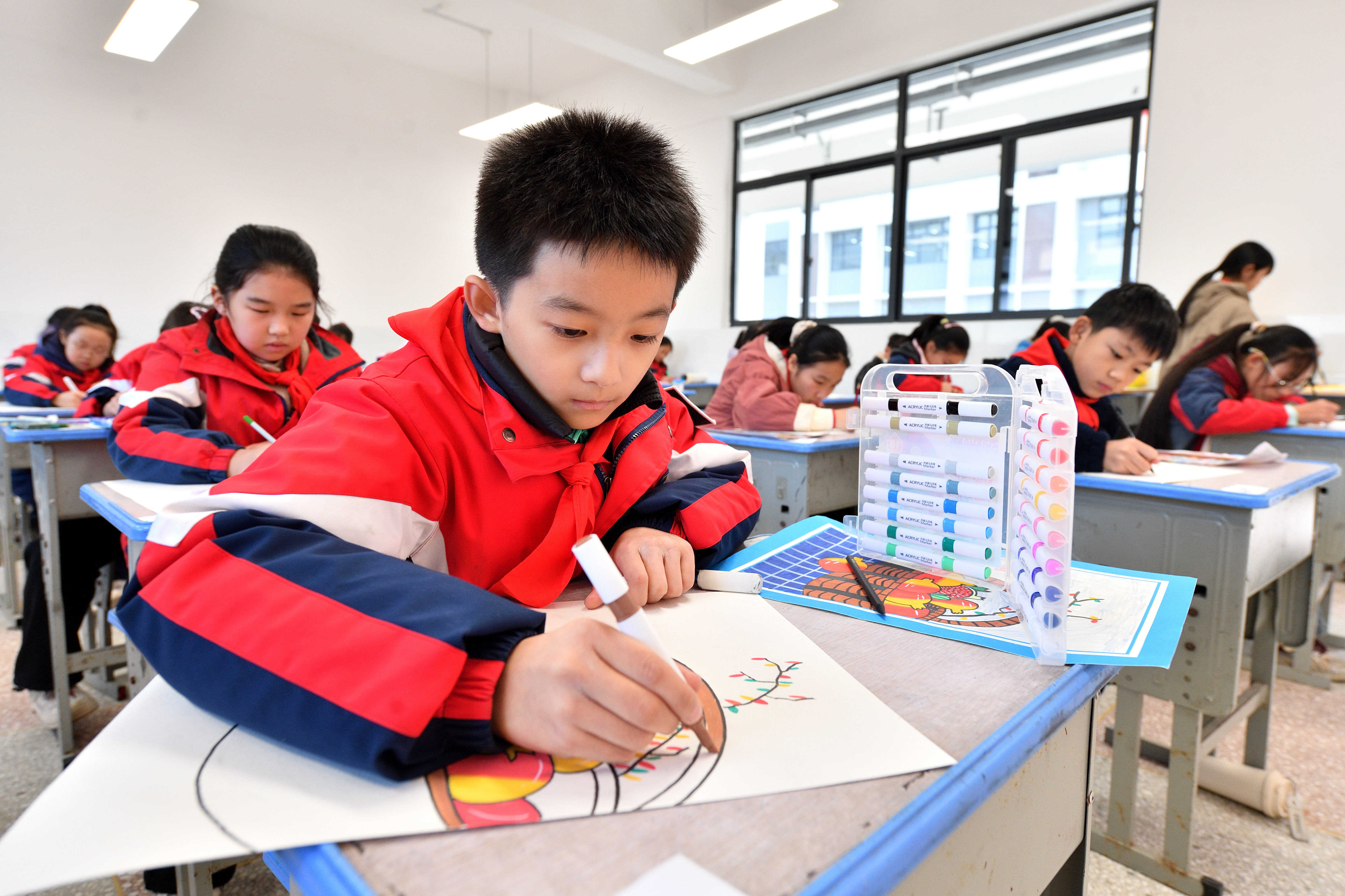 11月18日,湖北省襄陽市保康縣后坪鎮中心學校,學生們參加小學組繪畫比賽。楊韜 宋興虎 攝