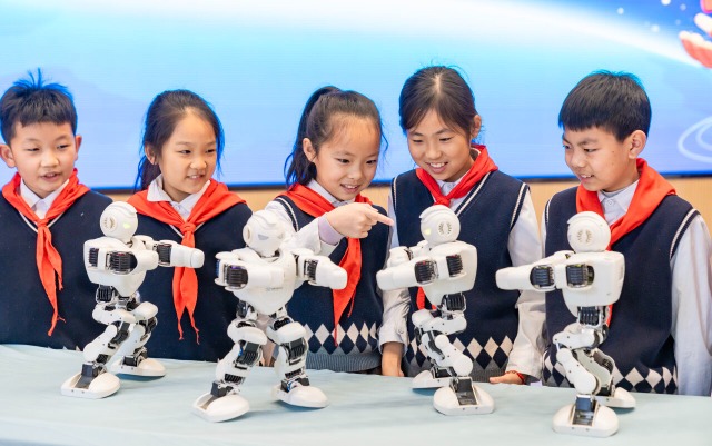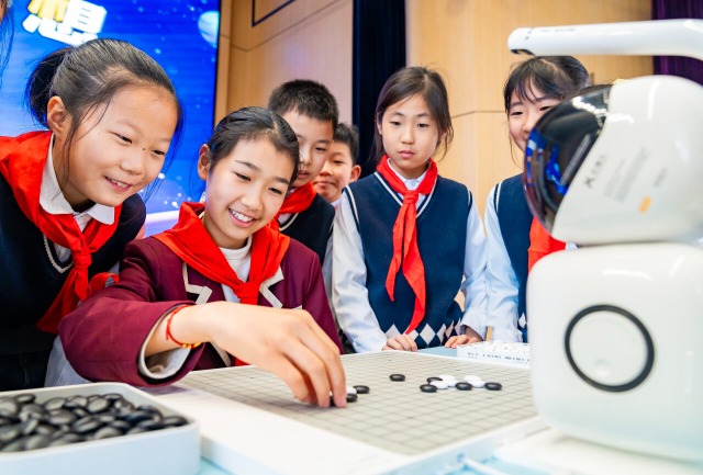 學生們在校園科技節上與AI機器人進行棋類對弈。通訊員 翟偉凱 攝