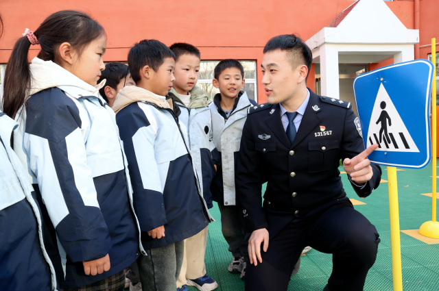 11月26日,江蘇省宿遷市公安局宿城分局府苑派出所民警向小朋友宣傳交通安全知識。民警以通俗易懂的語言講解交通安全知識,用游戲、問答等互動方式引導小朋友要遵守交通規則,增強交通安全意識,養成良好的文明交通安全習慣。中國教育報-中國教育新聞網通訊員 王力 攝