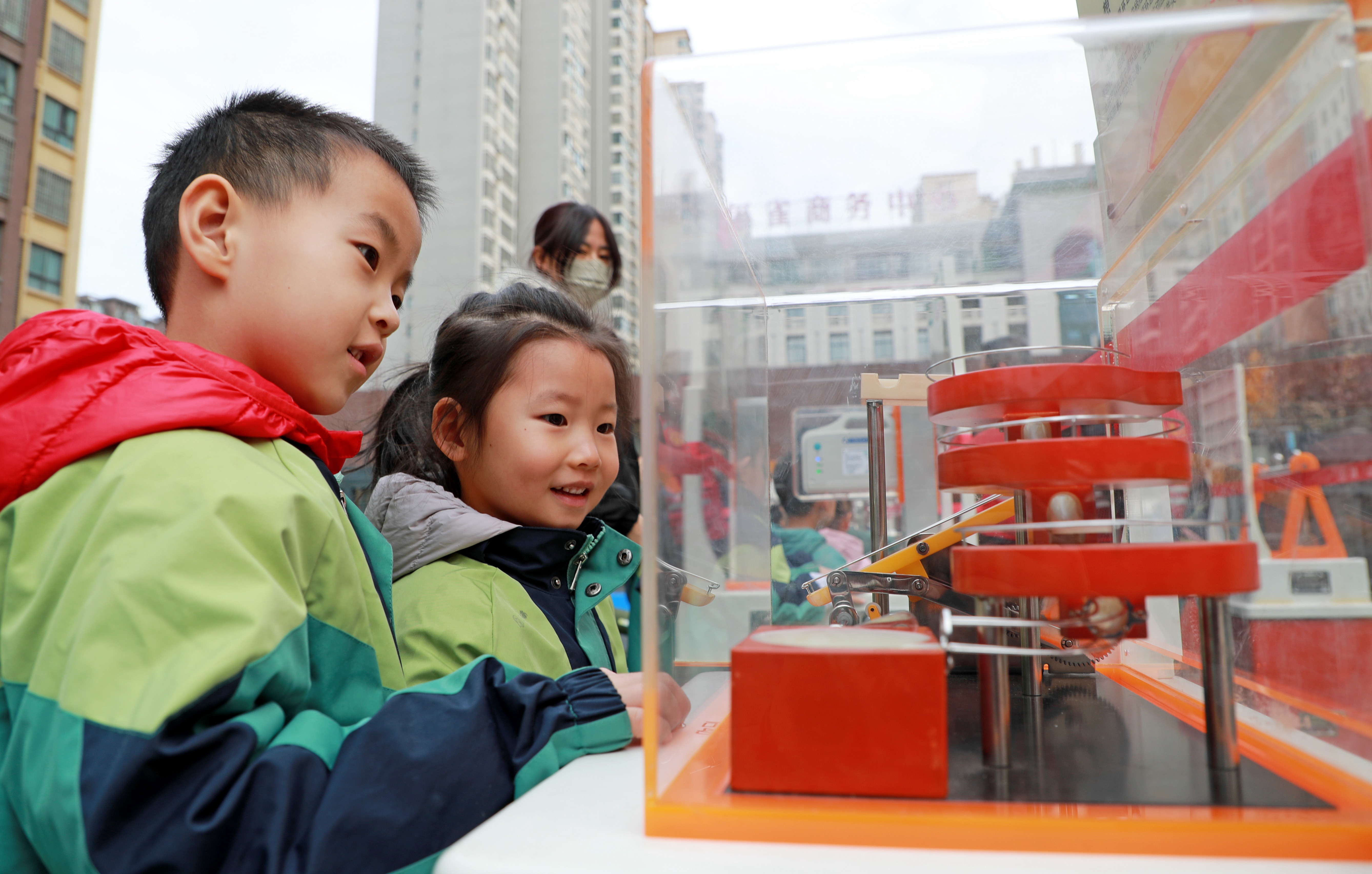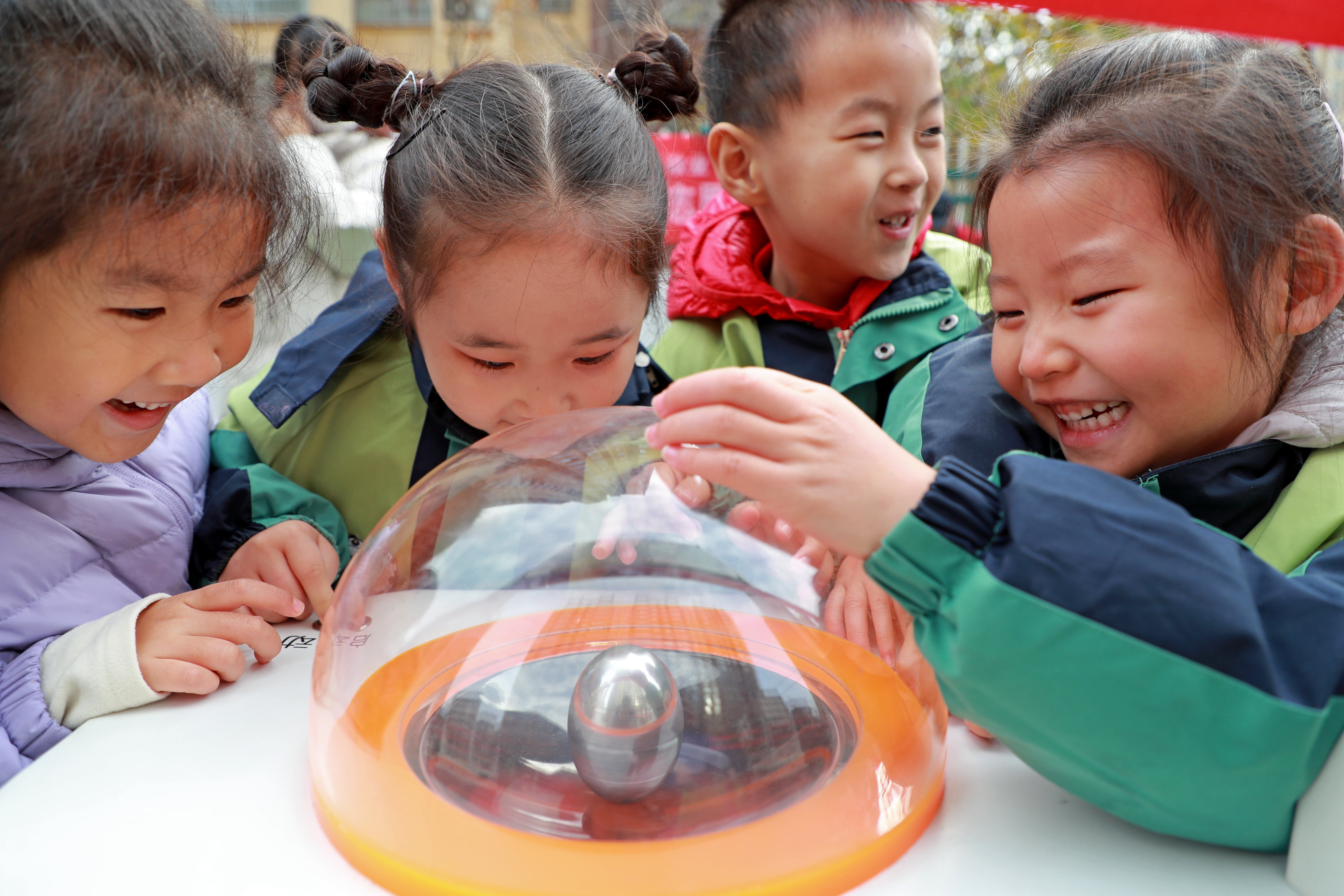 在陜西省渭南市臨渭區蘇園豐景幼兒園,小朋友體驗科普大篷車項目“旋轉的銀蛋”。通訊員 崔正博 攝