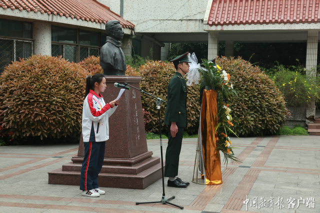 2021年清明節前夕,師生在吳亞魯烈士塑像前舉行紀念儀式 時道波攝(學校供圖)