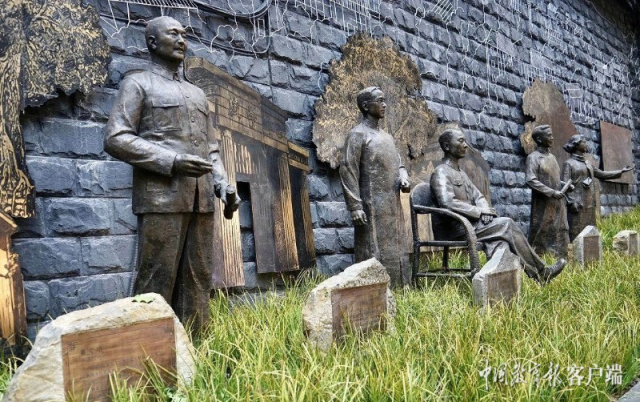 雕塑左起分別為:巴蜀學校教育思想奠基者黃炎培、巴蜀學校首任校長周勖成,中國新文化運動先驅者陽翰笙、中法學校校長吳玉章,革命烈士江竹筠