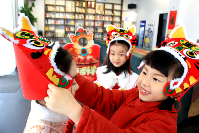 1月24日,在安徽省淮北市圖書館流動圖書服務(wù)點隋唐運河古鎮(zhèn)相山書院,孩子們戴上創(chuàng)意虎頭帽。周方玲 攝