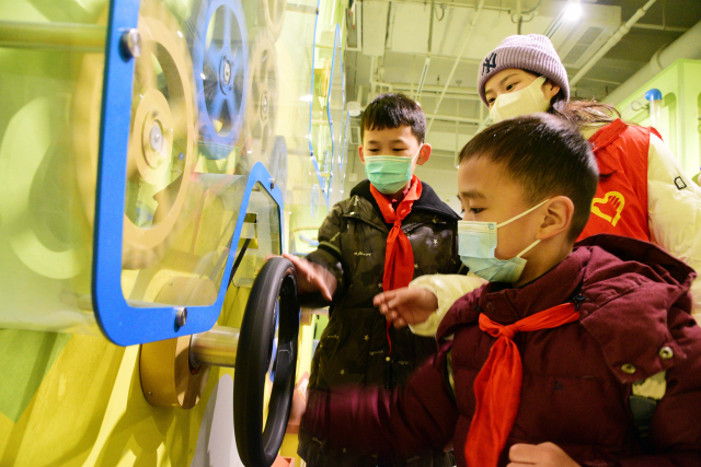 1月26日,在江蘇省鎮(zhèn)江市科技館,江蘇大學(xué)志愿者帶著鳳鳴新村社區(qū)的小朋友體驗“齒輪互動”科普游戲。石玉成 攝