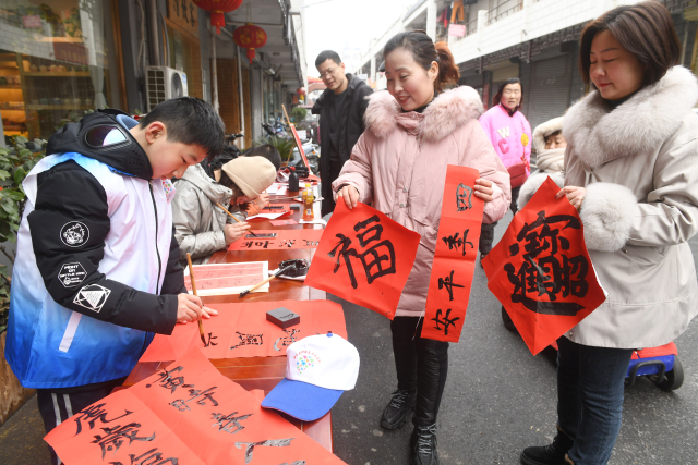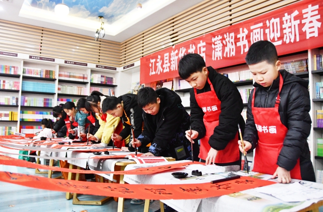 1月29日,湖南省江永縣新華書店聯(lián)合瀟湘書畫學(xué)校開展“寫春聯(lián)送祝福迎佳節(jié)”文化活動,少兒書畫愛好者免費為讀者送上春聯(lián)和祝福。春節(jié)將至各地組織書法愛好者開展寫春聯(lián)、送春聯(lián)活動,迎接即將到來的新春佳節(jié)。