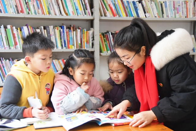 1月27日,在湖南省江永縣上江圩鎮(zhèn)夏灣村新時代文明實踐站,青年志愿者和小朋友一起閱讀書籍。寒假期間,該縣上江圩鎮(zhèn)招募青年志愿者,開辦留守兒童愛心托管班,為孩子提供免費的閱讀、學(xué)習(xí)、書畫創(chuàng)作環(huán)境,讓無法返鄉(xiāng)與子女團聚的家長們安心就地過年。