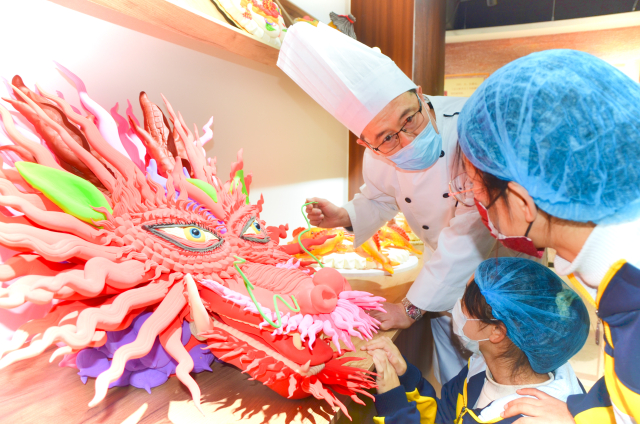 山東省威海市文登區(qū)高村中學(xué)的學(xué)生走進“非物質(zhì)文化遺產(chǎn)——花餑餑文創(chuàng)基地”,在非遺傳承人的指導(dǎo)下了解花餑餑的歷史、學(xué)做虎年花餑餑。