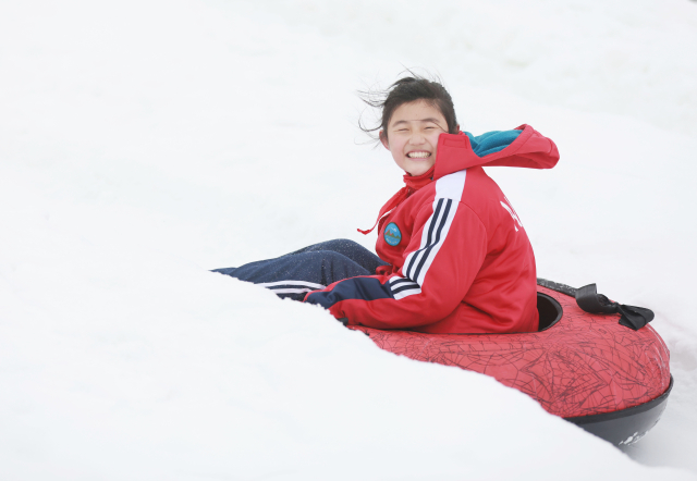 1月25日,河北省邢臺市內(nèi)丘縣南賽中心小學(xué)學(xué)生在體驗雪圈滑雪。劉繼東 攝