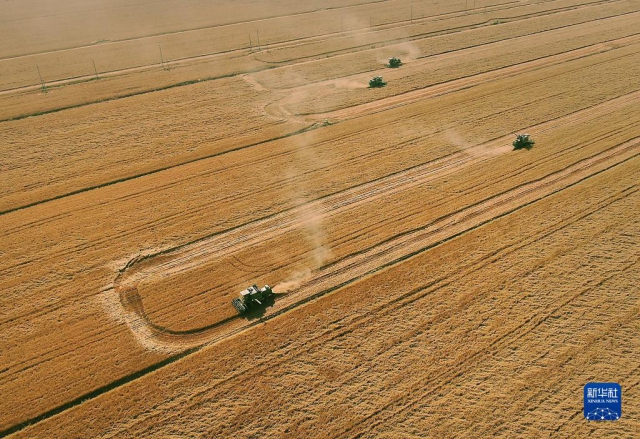 在河南省黃泛區農場九分場的麥田里,農機手操作收割機收獲小麥(2021年6月6日攝,無人機照片)。新華社記者 李安 攝
