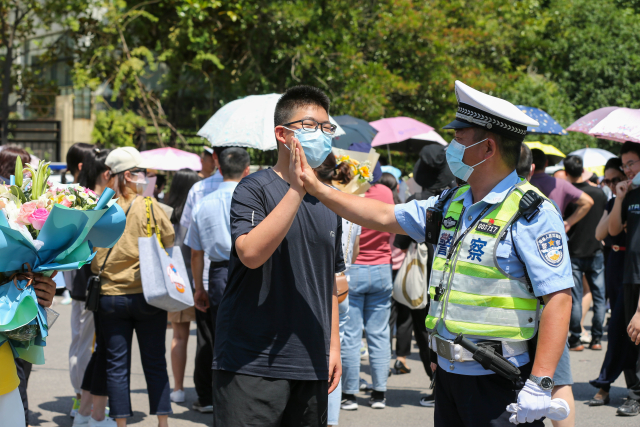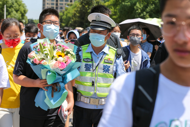 6月16日上午,安徽省中考最后一門科目考試結(jié)束,合肥市蜀山區(qū)第八中學(xué)考點(diǎn),有一對(duì)特殊的父子,他們各自順利地完成了同場(chǎng)“考試”。看到從考場(chǎng)里走出的兒子,合肥市公安局交警支隊(duì)公巡一大隊(duì)中隊(duì)長(zhǎng)唐超趕忙和愛人一起迎上去,為兒子送去鮮花。羅俊茹 攝