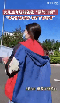?同一天,在黑龍江雙鴨山,在一名女生進考場前,其爸爸“霸氣叮囑:”考不好爸養你,考好了你養爸!”網友:父親這話技術含量真高。