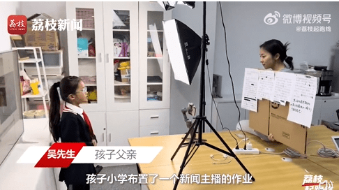 在江蘇南京,一小學布置了一項新聞主播作業,一名父親為了幫女兒完成作業,就在公司臨時搭建了一個迷你版“演播廳”。孩子父親吳先生表示,覺得這個作業挺鍛煉孩子的語言表達能力,為了效果好一點,就花了1個多小時搭了這個“演播廳”,希望以身作則,教育女兒學會認真對待每一件事。