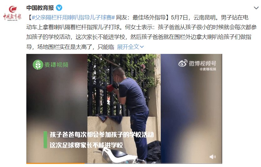 在云南昆明,一名父親站在電動車上拿著喇叭隔著欄桿指揮兒子打球。據悉,這位爸爸從孩子很小的時候就會每次都參加孩子的學校活動,因為這次家長不能進學校,所以孩子爸爸就在圍欄外邊拿大喇叭給孩子們做指導,場地圍欄實在是太高了,只能臨時站在電動車上,遠程給孩子們指導。
