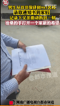 在河南安陽的趙同學收到了山東大學的錄取通知書。趙同學本科就讀于內蒙古科技大學,因心疼父母不易,大學期間寒暑假去飯店兼職過服務員,到電子廠兼職過臨時工,從未向家里要過生活費。除了生活上自強,趙同學的成績也非常優秀,最終成功保研至山東大學。錄取通知書到家之后,趙同學決定讓父親來拆封,父親用滄桑的手激動地一點點打開信封,也打開了一個家新的希望。