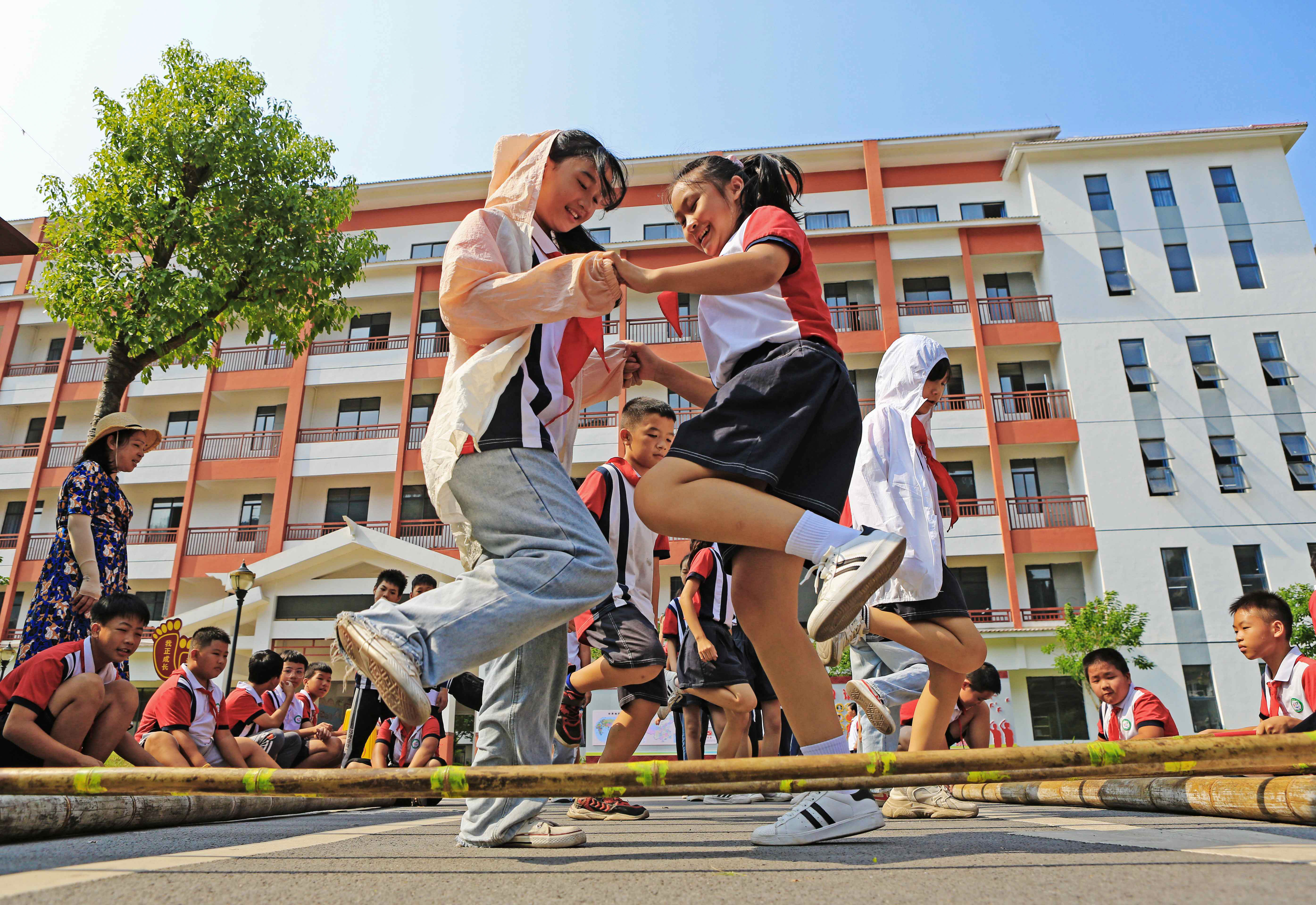 廣西壯族自治區(qū)柳州市融水苗族自治縣苗家小鎮(zhèn)小學生大課間開展跳竹竿活動。龍濤 攝