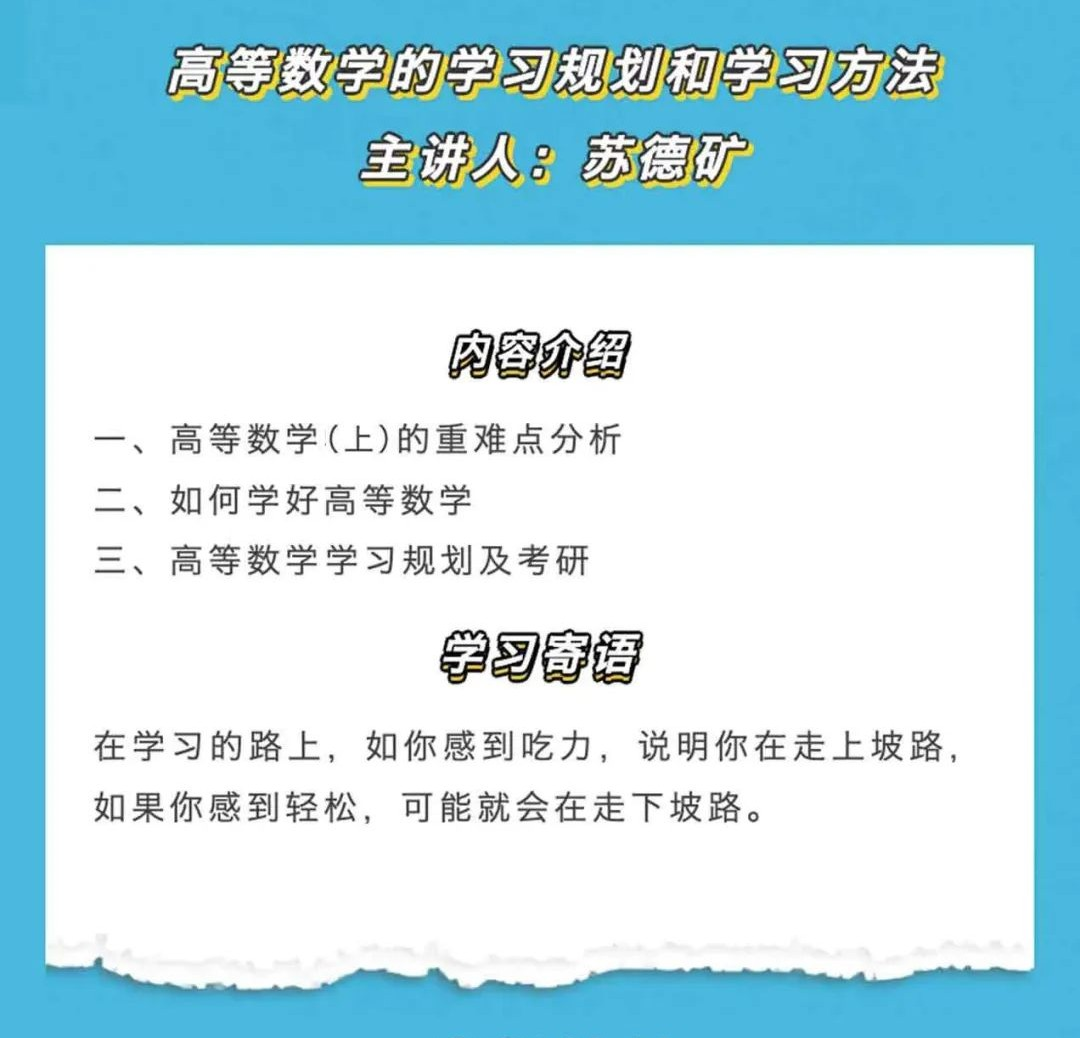 本期主題圍繞“高等數(shù)學的學習規(guī)劃和學習方法”話題展開,曾獲全國十大最美教師、能把數(shù)學課程變得妙趣橫生的浙江大學蘇德礦老師擔任主講。