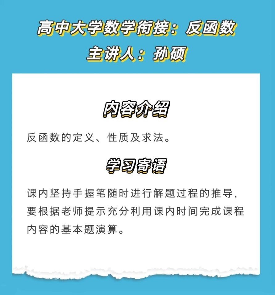 本期主題圍繞“高中大學銜接:反函數(shù)”話題展開,天津工業(yè)大學孫碩老師擔任主講。主要包括反函數(shù)的定義、性質(zhì)及求法等內(nèi)容。