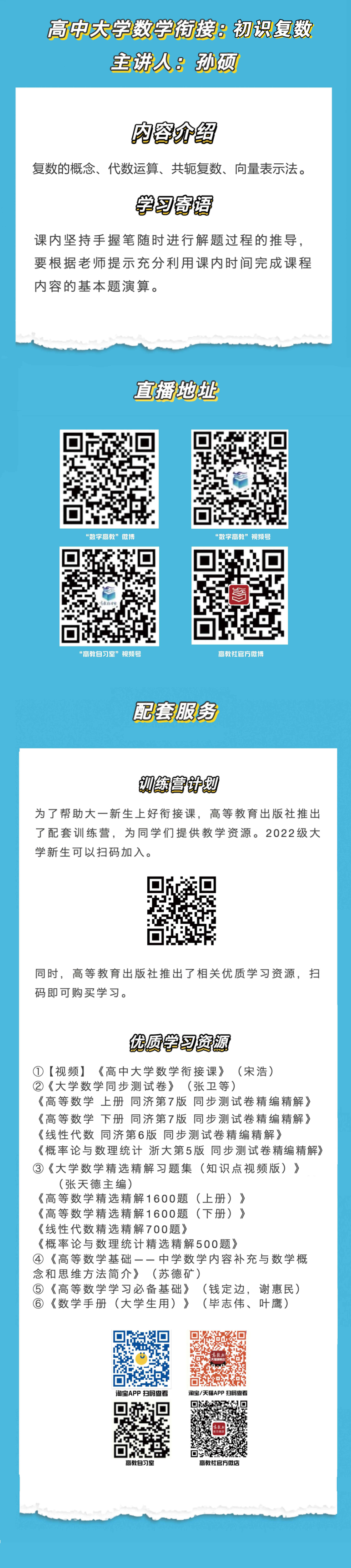 本期主題圍繞“高中大學銜接:初識復數”話題展開,天津工業大學孫碩老師擔任主講。主要內容包括復數的概念、代數運算、共軛復數、向量表示法等。
