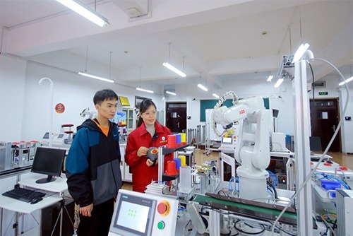 于是,李粉霞率先尋求校企合作之路,與蘇州勤美達精密機械有限公司連續九年開展“工學交替,頂崗實習”人才培養模式,實現了“校企雙主體”“過程四共同”(即共同制訂人才培養方案、共同組織實施培養過程、共同進行質量監控、共同安排就業) “效果五共贏”(學校、企業、教師、學生、家長);率先開展“理實一體化”教學模式改革,提煉并歸納大賽賽項、企業生產項目,開發賽訓融合課程;推行“三融合”項目化課程教學改革,建設實境化、企業化、生產化的校內實訓工廠,推行現場教學與虛擬仿真相結合、課堂教學與課外活動相結合,知識教學與能力培育相結合的“三結合”教學模式;率先開展“社團傳、導師幫、師傅帶、大賽練”的傳、幫、帶、練四級培優工程,更好地實現了“技能為本,立德樹人”的價值目標;率先為本科院校、贊比亞等海外學員開展師資培訓,承擔國培項目;率先成立數控技能大師工作室,淮海集團副總工程師“老匠人”李勇懷、中國運載火箭研究院首席技能專家韓利萍等11位技術精英成為駐校大師,共同培養創新拔尖人才,共同開展技術攻關、實施技術改造;率先在全省開展工業機器人技術專業,申報獲批教育部工業機器人技術應用人才培養中心,并掛牌成為ABB工業機器人技能認證中心,確立了全省領先地位。