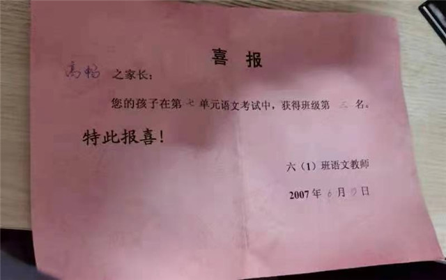 那是一張帶有波浪紋飾的粉底獎狀,上面赫然寫著幾行清秀的楷體字:“高暢之家長,您的孩子在第七單元語文考試中,獲得班級第三名。特此喜報!”