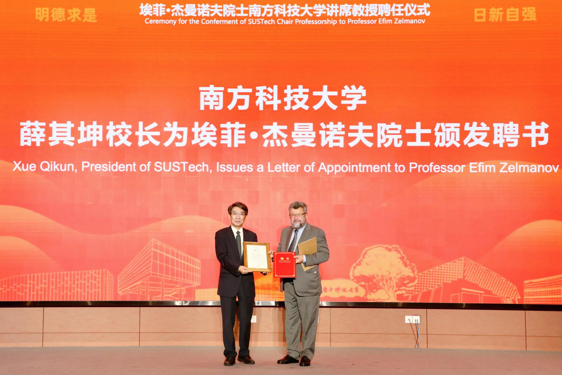 埃菲·杰曼諾夫(右)從南方科技大學校長薛其坤手中接過聘任證書。南方科技大學供圖