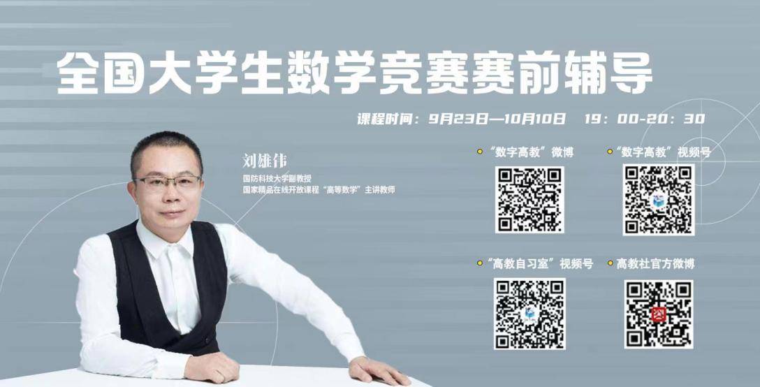 為了幫助同學們厘清思路、提升競賽能力,高等教育出版社秉持“植根教育、服務社會”的發(fā)展理念,啟動“全國大學生數(shù)學競賽賽前輔導”系列直播講座,通過整體的競賽思路以及分模塊講解,同學們將學習到體系化的解題思路與得分技巧,獲取全國大學生數(shù)學競賽的沖獎秘訣。