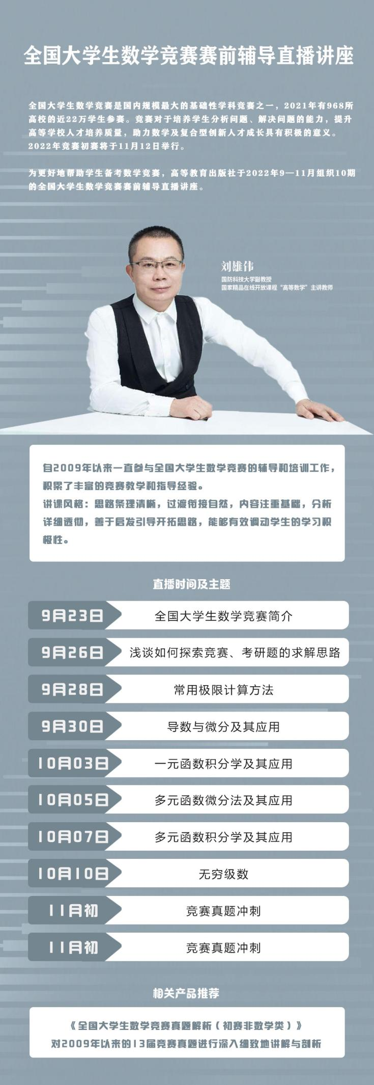 中國教育新聞網(wǎng)訊(記者 焦小新 通訊員 梁晶晶)高等教育出版社舉辦的“全國大學生數(shù)學競賽賽前輔導”系列直播講座將于9月23日啟動。