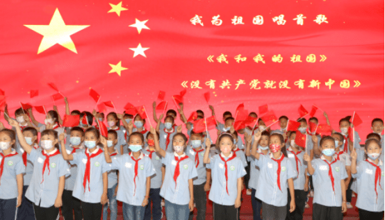 少先隊員們揮舞著國旗,合唱《我和我的祖國》《沒有共產黨就沒有新中國》,迎接中華人民共和國成立73周年。通訊員 田凱平 攝