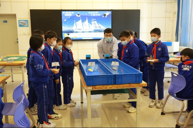 活動中,學校教師王楠通過隱身戰機的設計,引導孩子發現并解決問題,并結合動手操作,提升學生的認知和思考,促進學生應用能力的提升。在學生科技綜合實踐活動環節中,展示了“海”——帆船競速賽,“陸”——無人機穿越飛行,“空”——氣壓動力飛機、海空衛士艦載機、回旋飛機等“海陸空”三位一體的國防科技教育體系。此外,學校還設計并打造了科技長廊,將國防教育浸潤于學生的日常生活。學校體育教師還將國防教育與體育運動相結合,創編了系列國防健身操。