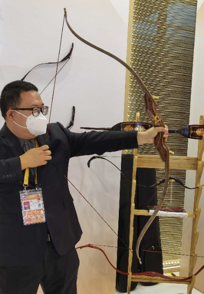 馬鑫在第五屆中國國際進口博覽會陜西展區展示非遺產品秦巴弓箭