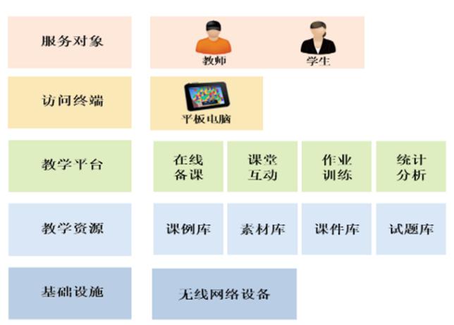 搭建智慧教學環境。學校以智慧課堂應用為切入點,利用平板電腦、電子白板、極域軟件和已有資源包,裝備電子書包設備,形成智慧課堂應用基礎架構(如圖2所示)。教師可在學校任意地點使用智慧課堂,師生手持平板電腦,在無線網絡支持下通過教學平臺互動功能,利用多媒體資源、學科性應用、診斷性評價等開展課堂教學活動。