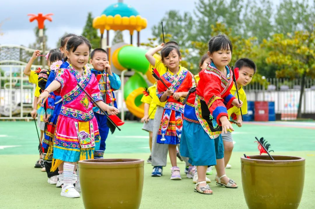浙江省湖州市長(zhǎng)興縣畫溪街道包橋中心幼兒園的多民族孩子一起體驗(yàn)趣味投壺。譚云俸 攝