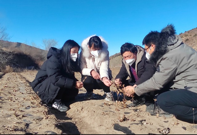 圍場縣銀里村黨支部書記孫國志(右二)和燕山大學駐村工作隊的同志,一起來到藥材種植戶高亞紅(左一)家的地頭,查看蒼術越冬情況,探討冬季蒼術種植養護小妙招。