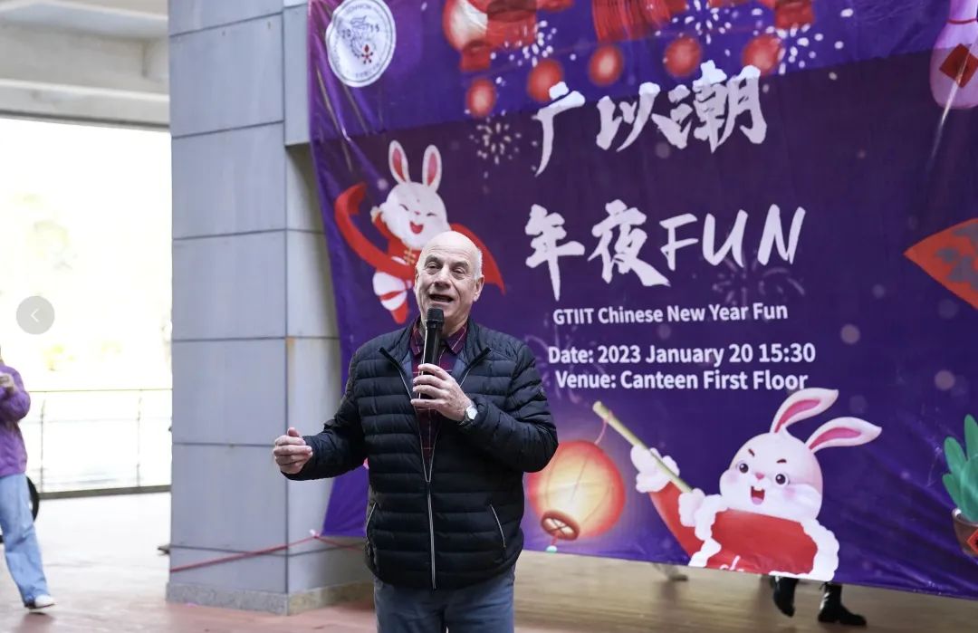 廣以常務副校長David Gershoni教授在活動現場致辭。“這是我第二次在廣以校園過春節。過去的一年,我們廣以大家庭的每一個人都在學習和科研的道路上持續努力、不斷突破。今年是兔年,祝愿我們新一年‘動如脫兔’,邁出廣以全新‘加速度’!”