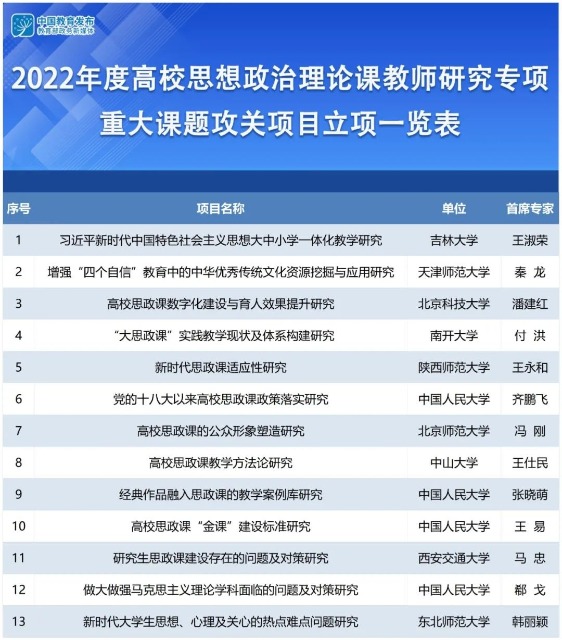 近日,經組織專家嚴格評審和面向社會公示,教育部公布2022年度高校思想政治理論課教師研究專項重大課題攻關項目,共有13項批準立項,一起來看名單。