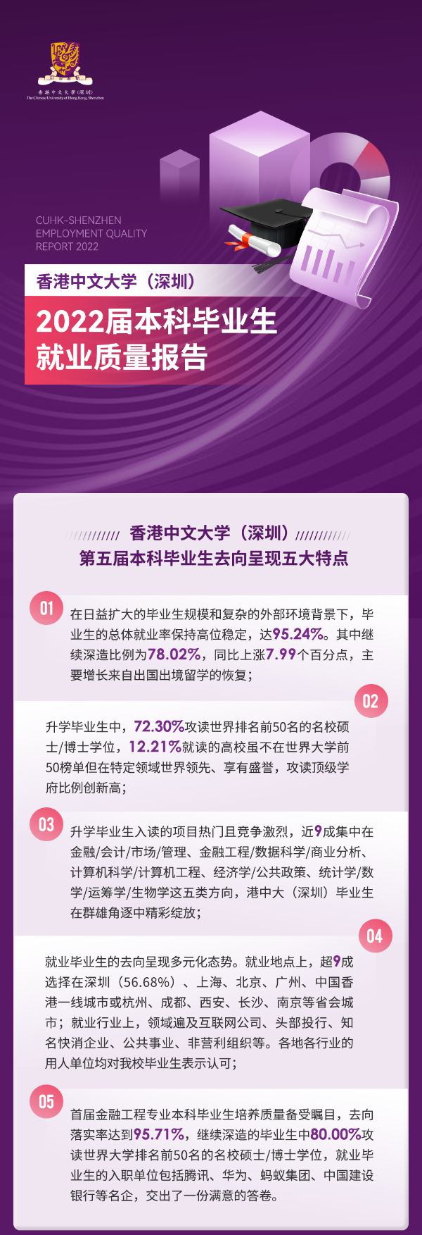 中國教育新聞網訊(記者 焦小新)2月26日,香港中文大學(深圳)正式發布2022屆本科畢業生就業質量報告。報告顯示:2022屆畢業生在保持高就業率的基礎上,在名校入讀比例、熱門升學項目、就業薪酬水平、就業領域多元化等方面取得高質量成果。畢業生去向呈現以下五大特點: