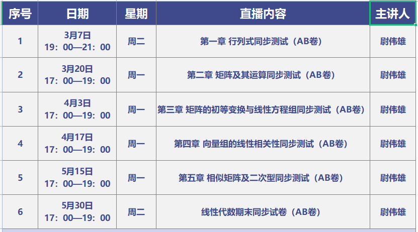 3月7日起,“高等數學伴學計劃”線性代數同步測試卷精講將正式上線,共設置6講直播課程,全面提升解題能力,助力破解線性代數難題,成功通關。