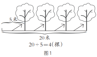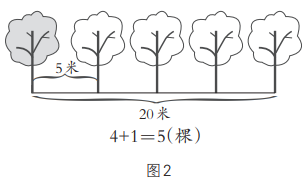20米長的線段,每5米一段,20米里面有多少個長是5米的一段,列式20÷5=4(個)或4(段)。有這樣的5米一段就栽一棵樹,共有4段這樣的5米,所以對應栽4棵(圖1)。用除法(總長÷段長=棵數)來計算,即20÷5=4(棵)。