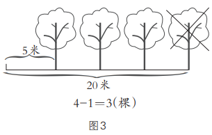 發現還是同樣滿足每5米栽一棵的條件,比圖1就多栽了一棵,即可直接用4+1=5(棵)來表示;受圖1栽法的啟發,我“*”掉圖1右端點上的一棵樹(圖3),也滿足每5米栽一棵的條件,比圖1就少栽了一棵,即可直接用4-1=3(棵)來表示。