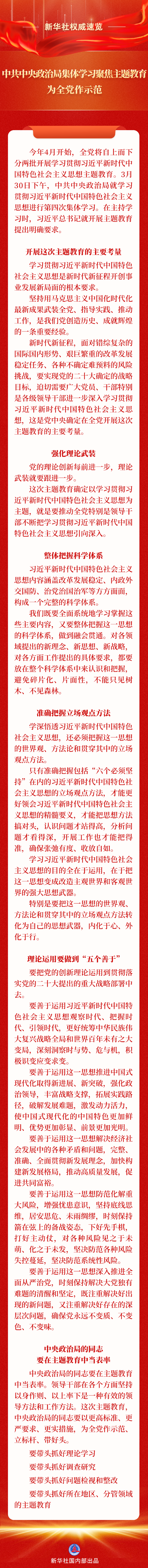 今年4月開始,全黨將自上而下分兩批開展學習貫徹習近平新時代中國特色社會主義思想主題教育。3月30日下午,中共中央政治局就學習貫徹習近平新時代中國特色社會主義思想進行第四次集體學習。在主持學習時,習近平總書記就開展主題教育提出明確要求。