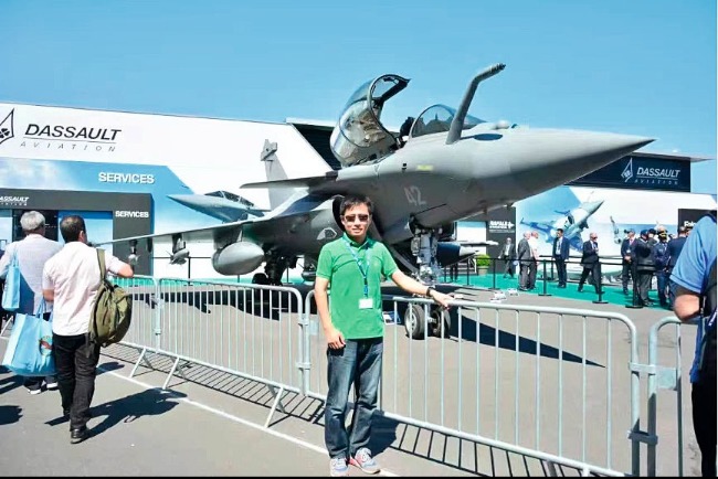 作者留學期間參加第52屆巴黎航展專業展并與“陣風”戰機合影