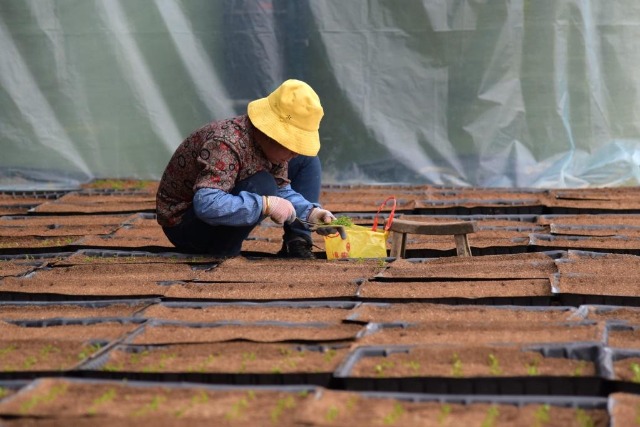 2月28日,村民在定西現(xiàn)代絲路寒旱農(nóng)業(yè)綜合示范園區(qū)移栽馬鈴薯脫毒種苗。新華社記者王朋 攝