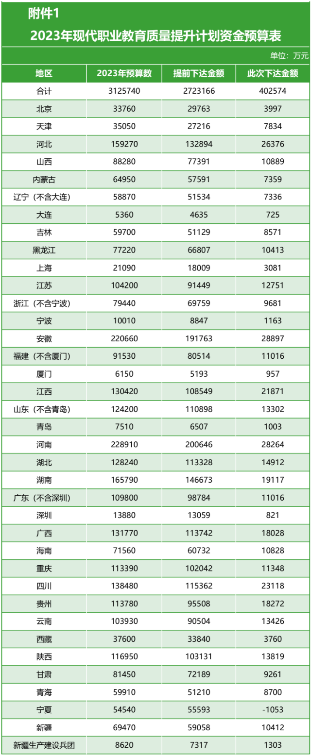 中國教育報-中國教育新聞網訊(記者 歐媚)記者近日從財政部獲悉,教育部、財政部印發《關于下達2023年現代職業教育質量提升計劃資金預算的通知》,下達2023年現代職業教育質量提升計劃資金預算。此次下達金額為402574萬元,加上提前下達的2723166萬元,共下達2023年現代職業教育質量提升計劃資金預算3125740萬元,比上年增加10億元。