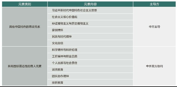 要打通要素堵點,首先應(yīng)充分挖掘育人元素,形成具有中外合作辦學(xué)特色的課程思政元素體系。為切實消除外方對課程思政的認知誤區(qū),在教育實踐中要著重區(qū)分具有國際普適性的育人元素(如科學(xué)精神、社會責(zé)任、誠實守信等)和具有中國特色的思政元素(如社會主義核心價值觀、家國情懷、理想信念等),從中外雙方形成共識的普適性元素入手,系統(tǒng)分析國際教育界開展思政育人的共同點和相近點,充分挖掘國際普遍認同的育人元素,形成具有雙方共識且有利于中外合作辦學(xué)持續(xù)健康發(fā)展的課程思政元素體系。
